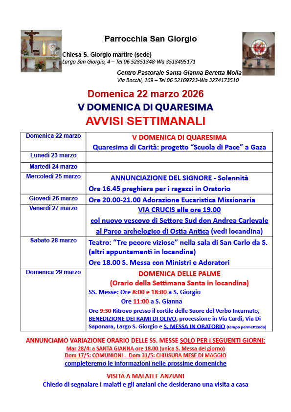martedì e sabato (presenza del Parroco)